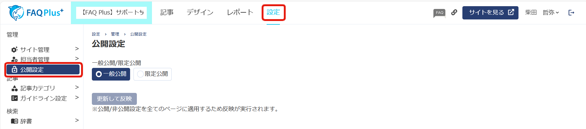 (1) 管理画面上部の設定>公開設定をクリックします。