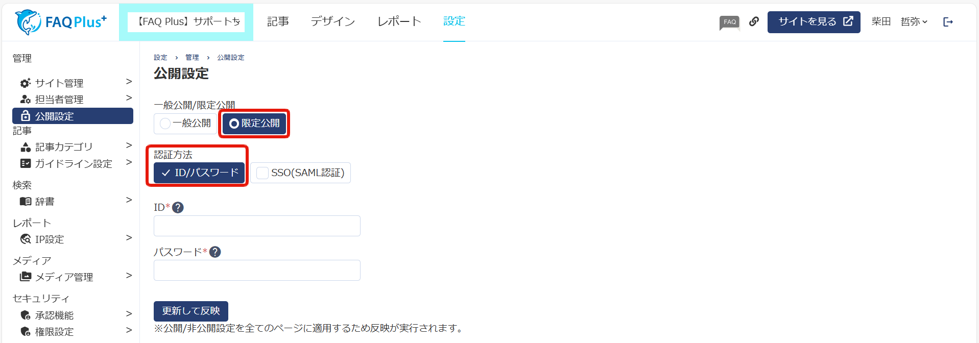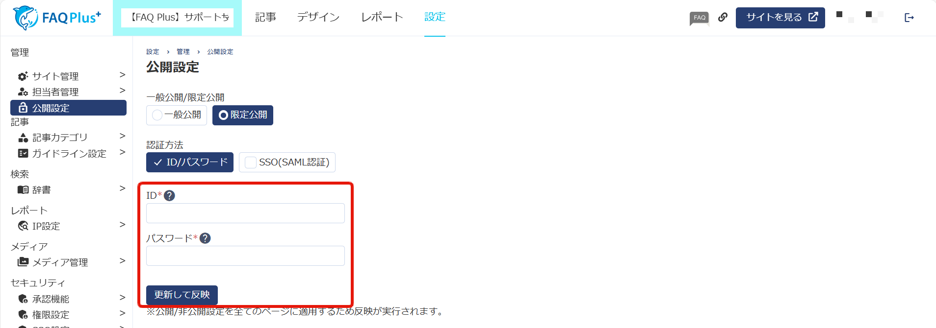 FAQページには、ID/パスワードによる認証を設定し、公開・非公開を切り替えることができます。