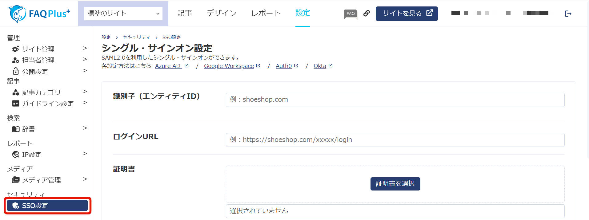 FAQPlusの管理画面へのログインには、SSO(シングルサインオン)をご利用いただけます。