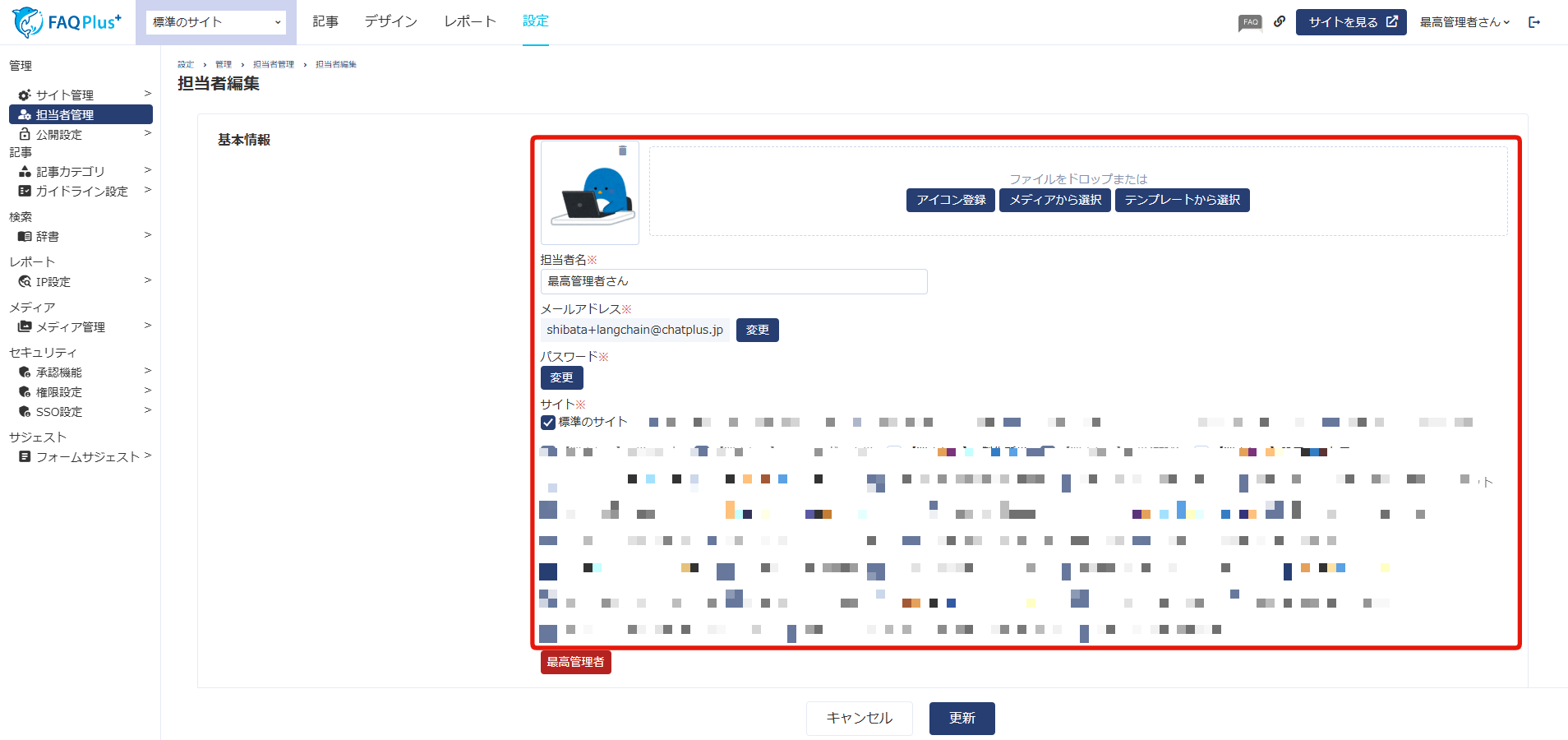 「担当者管理」とは、FAQPlusの管理画面にログインするためのアカウント情報(ID・パスワード)を設定・管理する機能です。