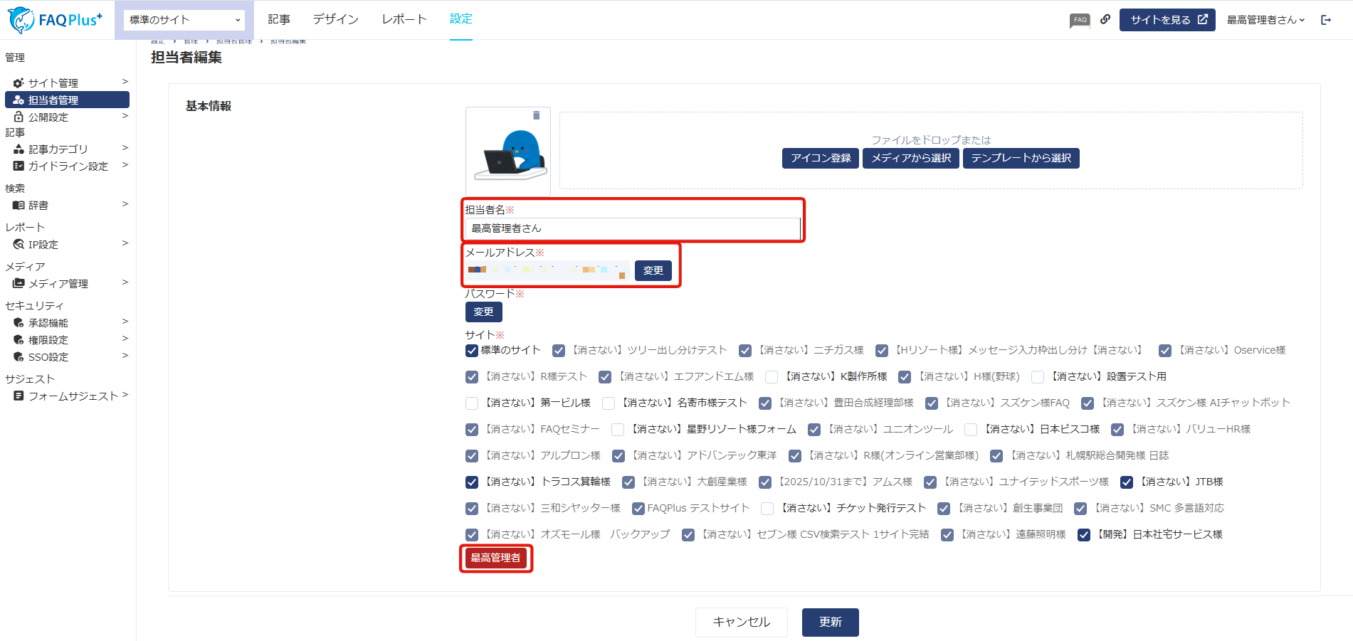 最高管理者を他の方に変えるには、アカウントの編集画面から、担当者名やメールアドレスを変更ください。