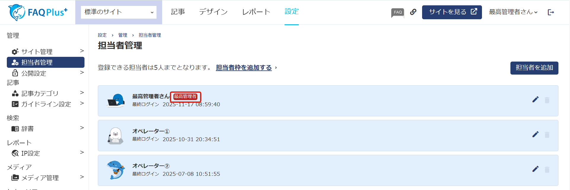 管理画面上部の設定>担当者管理画面で、一番上に表示されているアカウントが最高管理者です。
