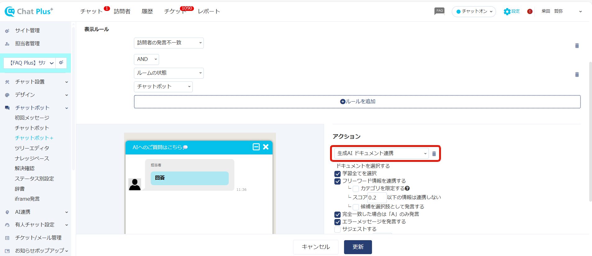 (5)チャットボット+の設定画面で、アクションを「生成AI ドキュメント連携」を設定すると、「生成AI - FAQPlus」の情報を基にAIが回答します。
