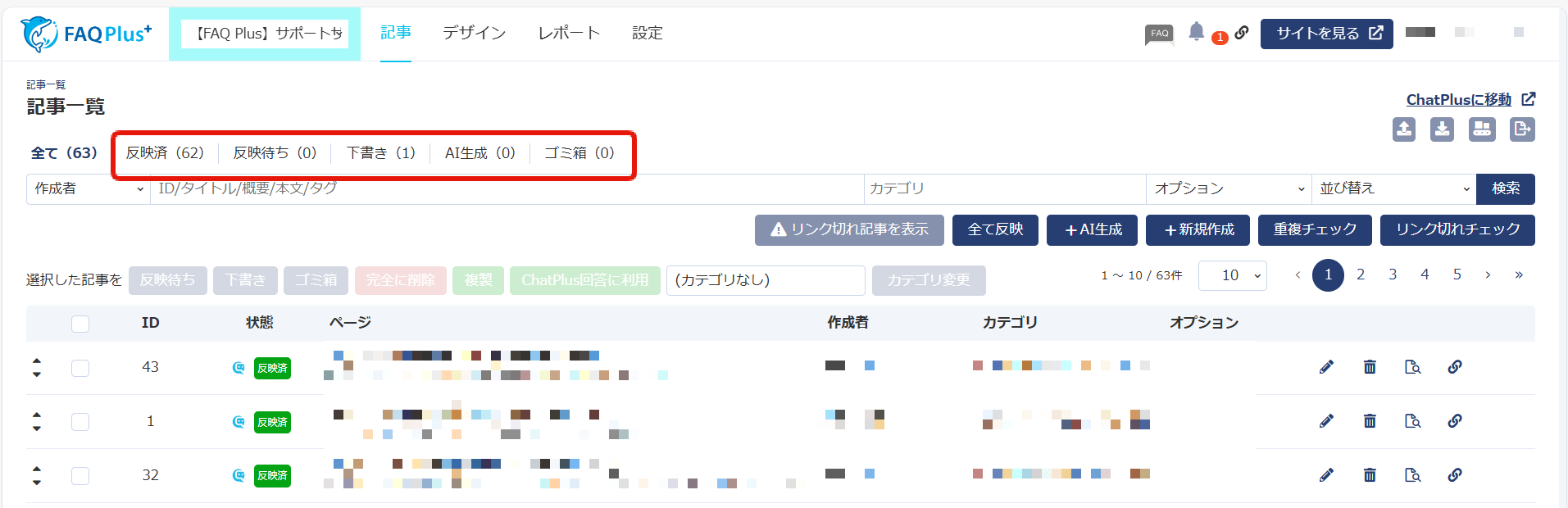 ・各記事のステータスを変更した後は、「全て反映」ボタンをクリックし、ステータスを変更してください。
