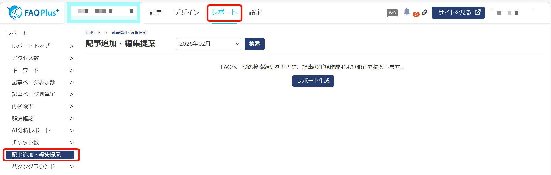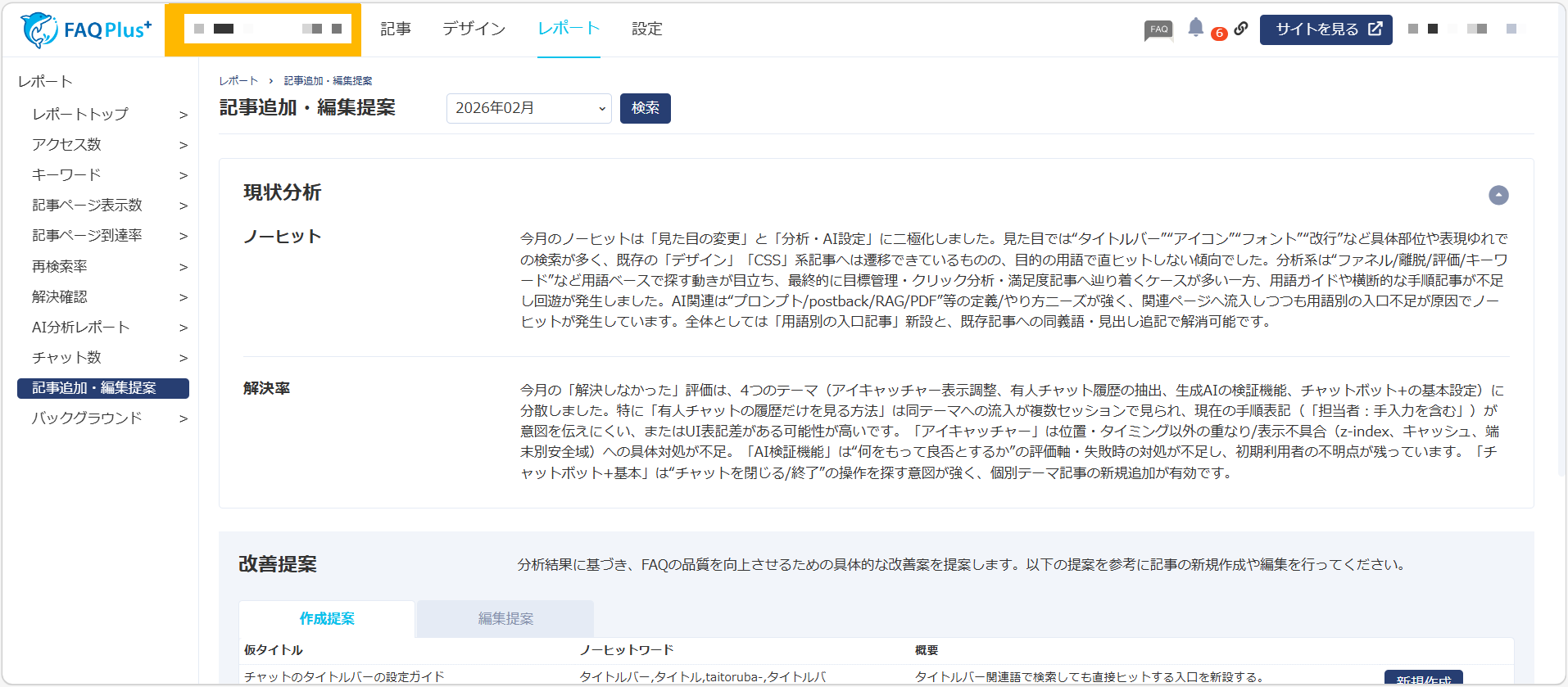 「記事追加・編集提案」は、FAQサイトの利用履歴をAIが分析し、 「記事の新規追加」や「既存記事の改善」 を提案するレポート機能です。